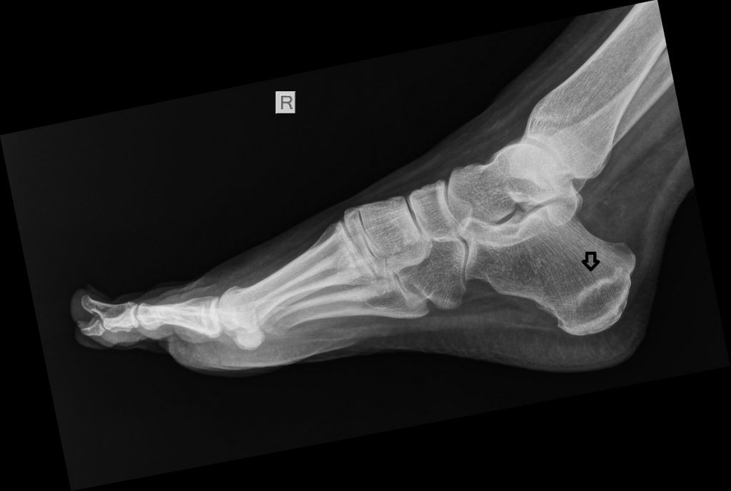 Heelpain in persons who stand long periods or walk far can be the result of a calcaneal stress fracture. Smoking or female sex seem to be risk factors to take into account. Treatment is a period of non weight bearing and vitamin D.